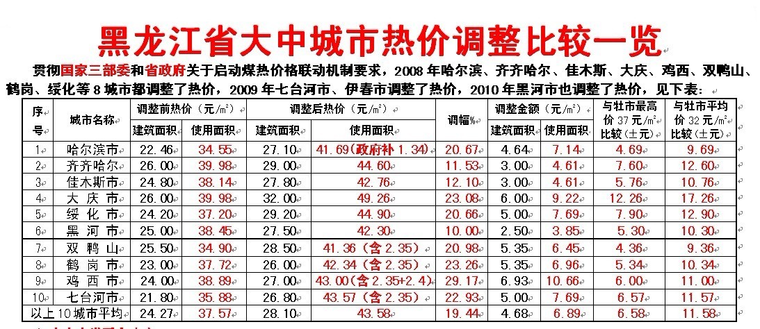 貫徹國家三部委和省政府關于啟動煤熱價格聯(lián)動機制要求,2008年哈爾濱、齊齊哈爾、佳木斯、大慶、雞西、雙鴨山、鶴崗、綏化等8城市都調整了熱價,2009年七臺河市、伊春市調整了熱價,2010年黑河市也調整了熱價,見下表: